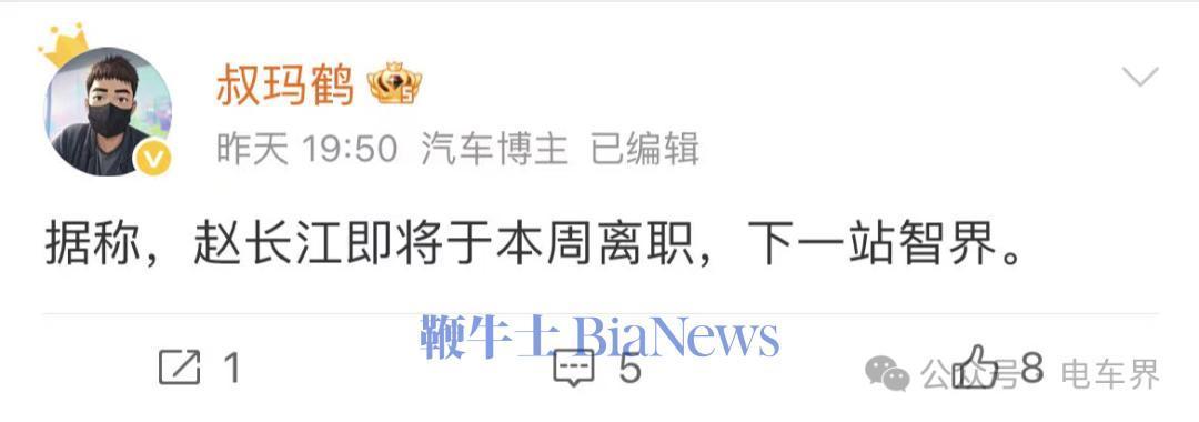 昨日晚间,汽车博主“叔玛鹤”发文:据称,赵长江即将于本周离职,下一站智界。
