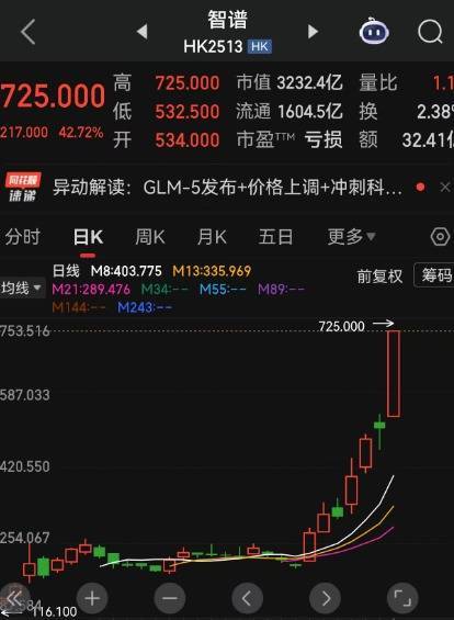 港股开盘后,大模型公司智谱和MINIMAX股价均大幅上涨,其中智谱在经过早盘震荡后,午后股价不断上扬,先后突破600、700大关,最高触及739港元/股,一度涨幅超过45%,截至收盘智谱涨近43%,报725港元/股,市值达到3232.4亿港元,市值增加超过967亿港元,相当于一日之内涨出了一个B站。从2月9日行情启动以来,智谱涨幅超过256%。