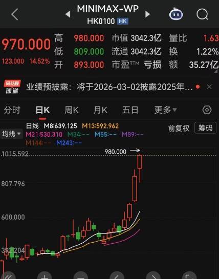 MINIMAX也表现亮眼,在早盘高开低走之后,从809港元/股的低位展开反攻,日内一度涨幅超过15%,逼近1000港元大关,截至收盘,MiniMax涨超14%,报970港元/股,市值达到3042.3亿港元,从1月9日上市以来,MiniMax涨幅达到487.88%。